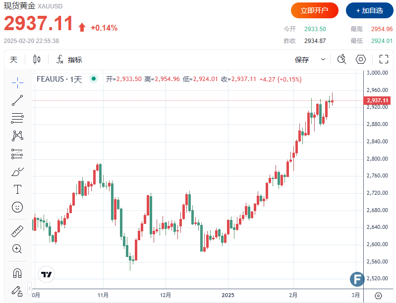 FX168财经报社(北美)讯 周四(2月20日),黄金价格刷新历史纪录,突破每盎司2950美元,因市场担忧美国总统唐纳德·特朗普(Donald Trump)的关税威胁将引发全球贸易战,推动投资者避险需求上升。