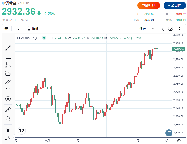 截至发稿,现货黄金下跌0.23%,至2,932.36美元/盎司。