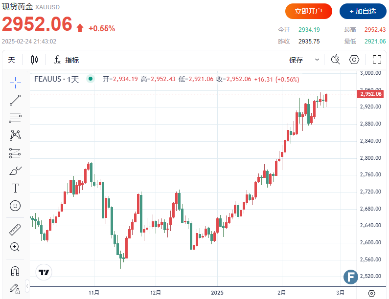 截至发稿,现货黄金上涨0.55%至2,952.06美元/盎司,此前上周曾创下2,954.69美元/盎司的历史新高。