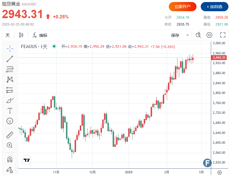 截至发稿,现货黄金上涨0.25%至每盎司2,943.31美元,盘中一度触及2,956.29美元,创下2025年第十一次历史新高。同时盘中也一度险些跌破2,920美元。